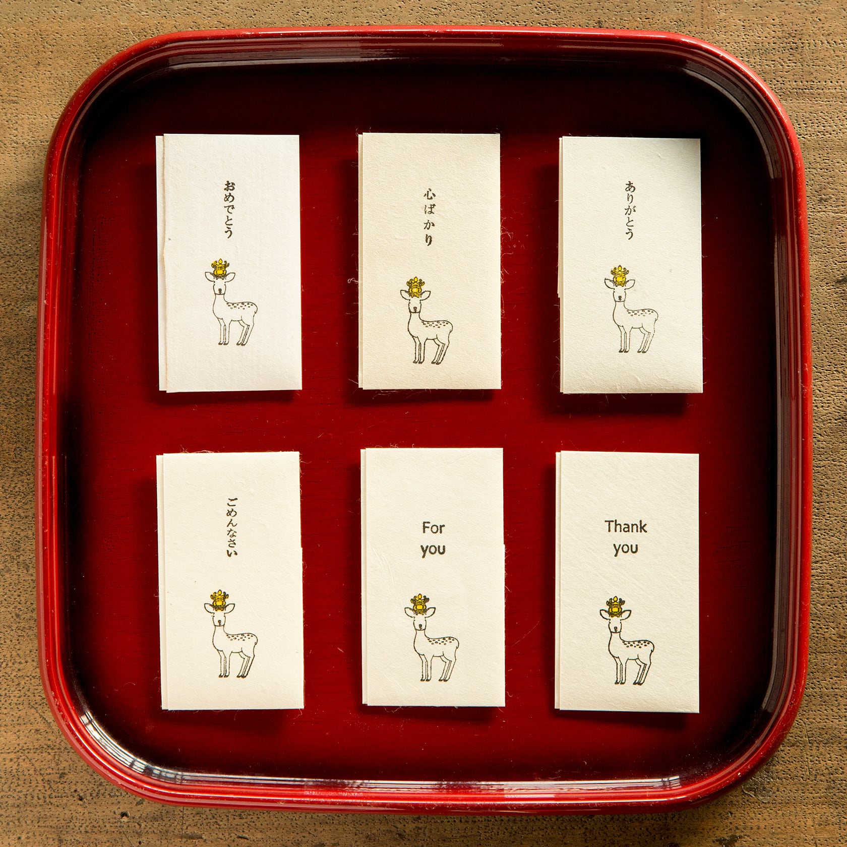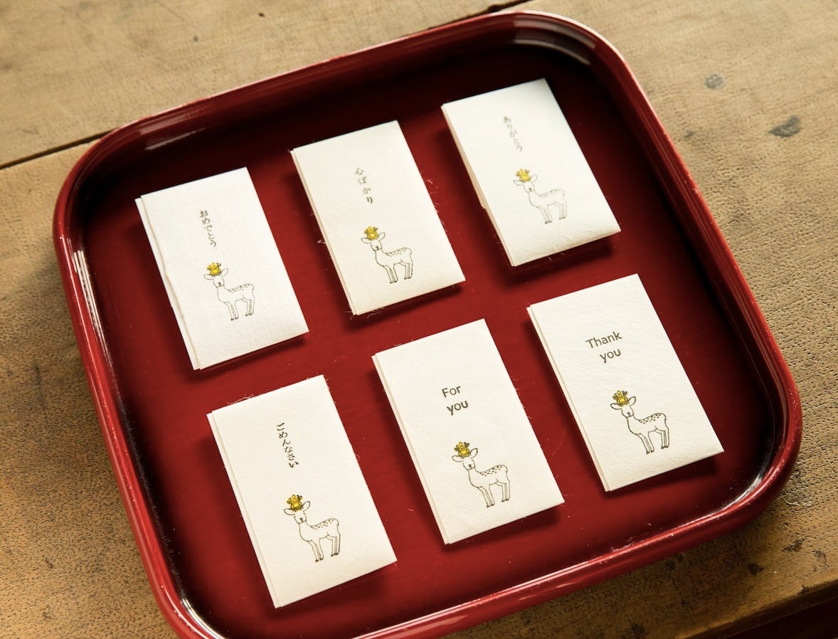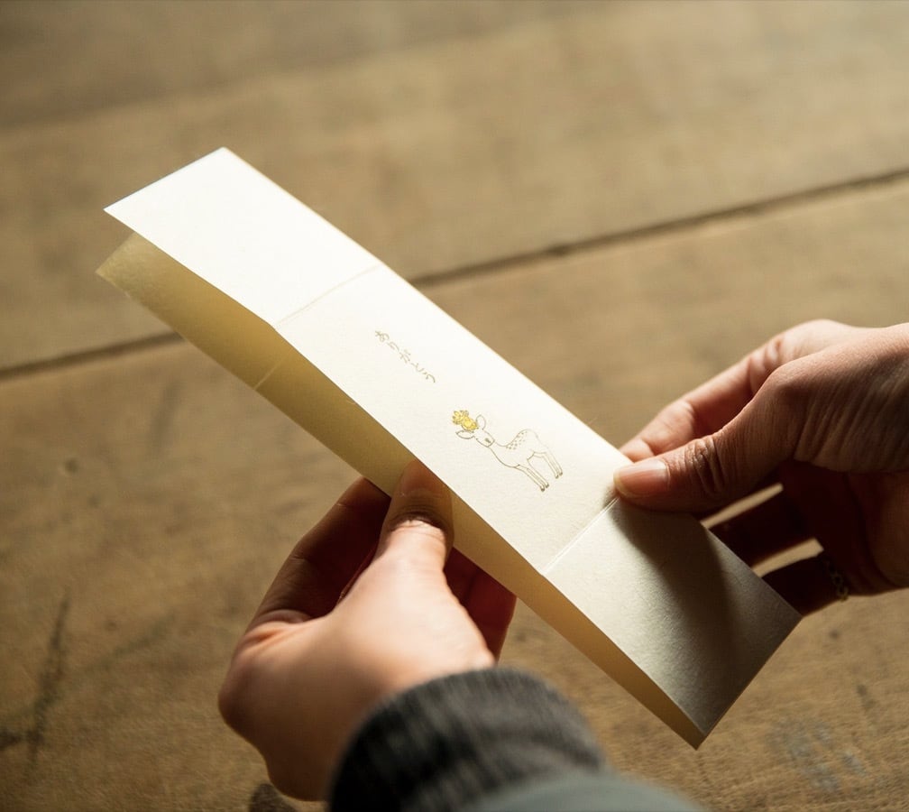 ご祝儀袋のように包むタイプのぽち袋で、鹿が金灯籠を頭にのせたデザインです。